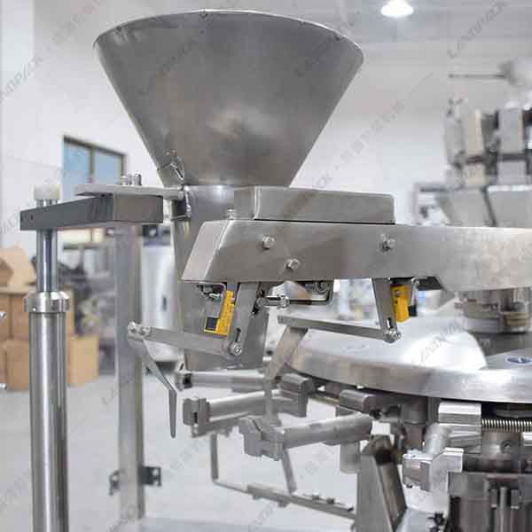 5、下料環(huán)節(jié):設(shè)備根基袋型尺寸,配套合適的不銹鋼下料斗,下料斗更換方便;