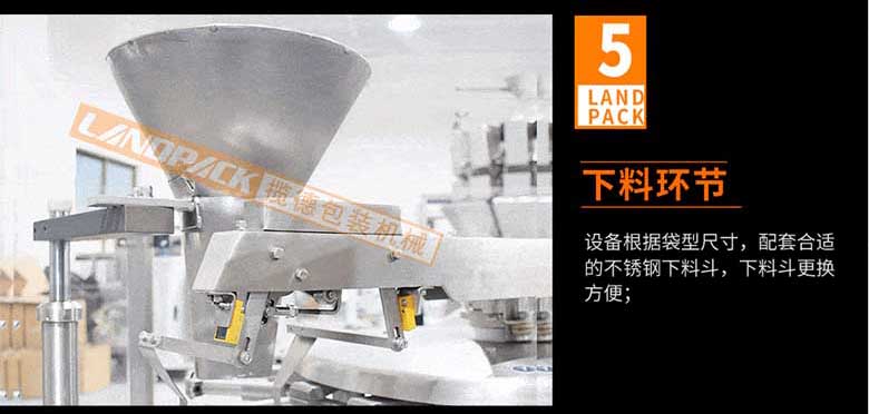 5、下料環(huán)節(jié):設(shè)備根基袋型尺寸,配套合適的不銹鋼下料斗,下料斗更換方便;