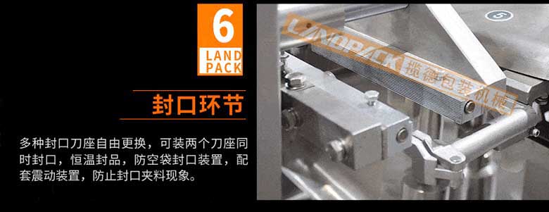 6、封口環(huán)節(jié):多種封口刀座自由更換,可裝兩個(gè)刀座同時(shí)封口,恒溫封品,防空袋封口裝置,配置震動裝置,防止封口夾料現(xiàn)象。